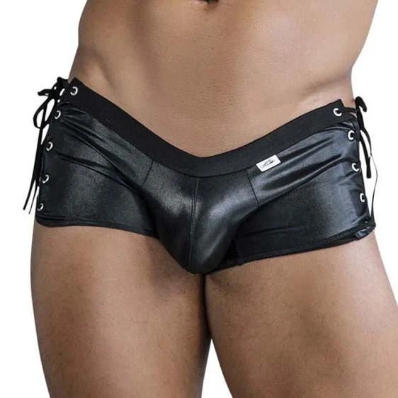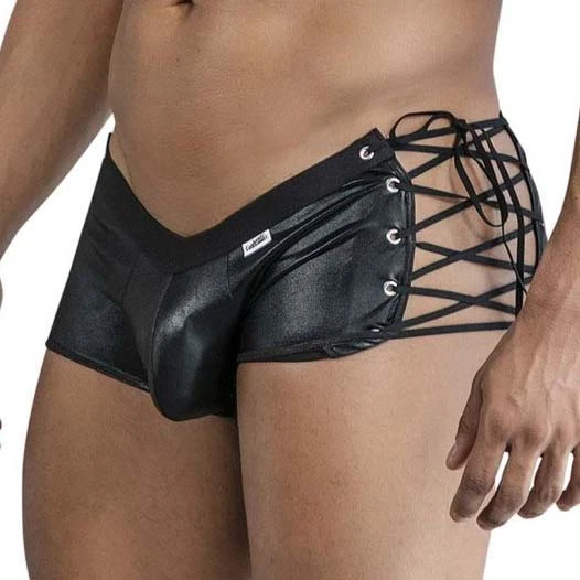 Boxer Candyman Side Tie 99820. Boxer audacieux avec son effet mouillé et ses lacets latéraux réglables. Ce boxer allie à la perfection attitude et sensualité. 96% Polyester, 4% Elasthanne.