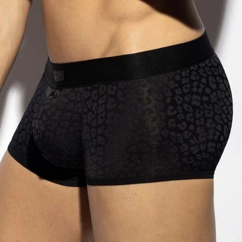 Boxer ES Collection Leopard UN624. Boxer sexy & luxueux avec un imprimé léopard noir sur un tissu transparent séduisant. Matière ultra-extensible avec une grande poche avant.Coupe taille basse ajustée. Etiquette ES Collection en silicone sur la ceinture. 92% Polyamide, 8% Elasthanne.