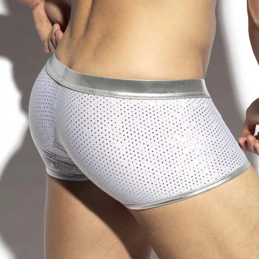 Boxer ES Collection Party UN587. Découvrez ce Boxer exceptionnel au tissu extra fin extensible Film métallique brillant laminé en argent partout. Poche frontale généreuse qui vous assure un excellent maintien. Ceinture élastique avec le logo au nom de la marque. Taille basse. 80% Polyamide, 20% Elasthanne.