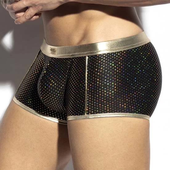 Boxer ES Collection Party UN587. Découvrez ce Boxer exceptionnel au tissu extra fin extensible Film métallique brillant laminé en argent partout. Poche frontale généreuse qui vous assure un excellent maintien. Ceinture élastique avec le logo au nom de la marque. Taille basse. 80% Polyamide, 20% Elasthanne.