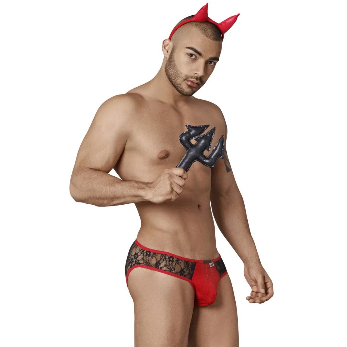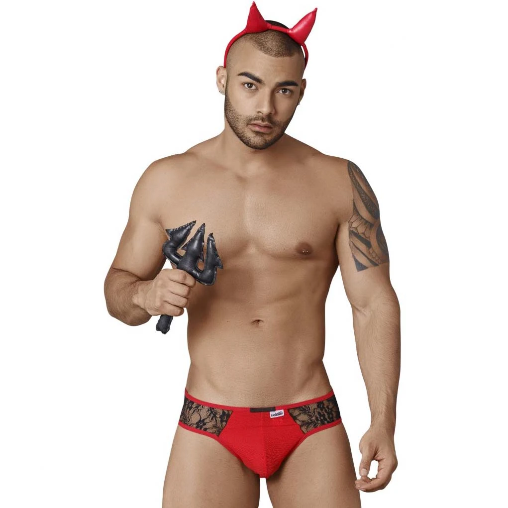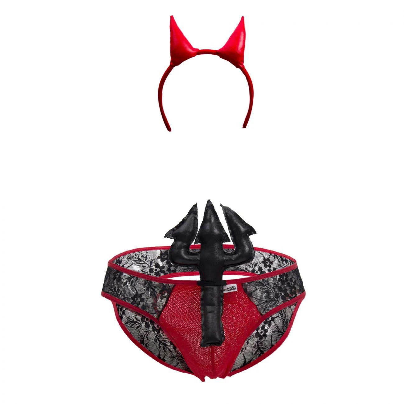 Costume Diable Candyman 99356. Ce costume est composé d’un jock strap en dentelle, un serre tête et un trident. Avec ce costume vous allez être diabolique ! Cet ensemble pourra pimenter votre jeu de séduction. 96% Nylon, 4% Elasthanne