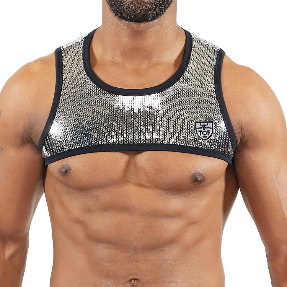 Harnais Broadway TOF PARIS H0016A. Harnais léger et confortable avec sa matière en microfibre. Il saura vous mettre en avant grâce à sa coupe ajustée. Harnais élégant et sexy recouvert de paillettes. Coutures contrastées. Ecusson au nom de la marque sur la poitrine. 100% Polyester.