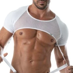 Harnais Circuit Mesh TOF PARIS TOF236B. Demi haut à manche dans un mélange lycra et mesh ajouré. La tenue parfaite pour une silhouette de gogo dancer ! coupe moderne mettant bien en valeur le buste. Logo TOF Paris en similicuir argenté côté cur. 90% Polyamide, 10% Elasthanne.