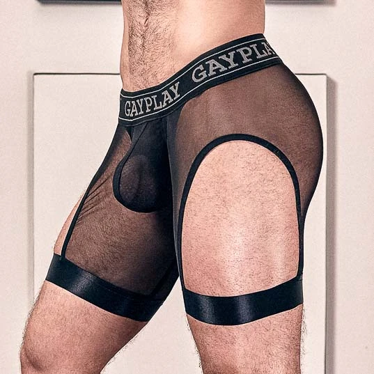 Legging GAYPLAY. Un legging sexy grâce à sa forme originale. Ouvert sur le devant et sur les cuisses pour être plus séduisant que jamais ! Des sangles autour du bas des cuisses. Ceinture élastique logotée au nom de la marque. (Sur la photo le mannequin porte un string en mesh reference 87-MESHTHONG sur le site ). 100% Polyester.