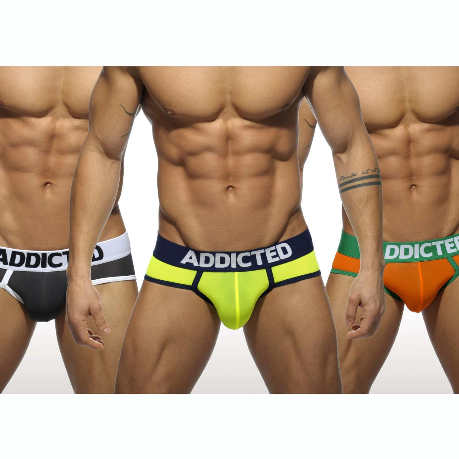 Pack de Slips Addicted AD402P. Lot de trois Slips taille basse et sexy de couleurs lumineuses en microfibre douce et respirante. Bordures de couleurs contrastées. Ceinture élastique logotée ADDICTED devant et deriÚre. 80% Polyamide, 15% Elasthanne, 5% Coton.