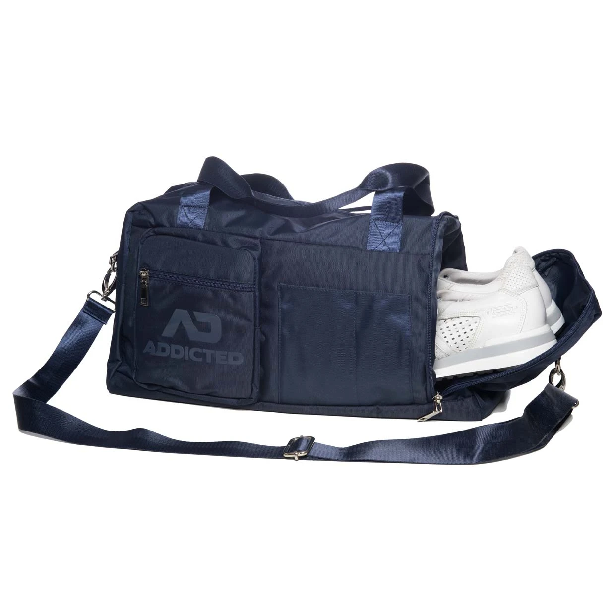 Sac de sport Addicted AD1075. Sac de sport 48 centimètres de longueur, 21 centimètres de largeur, 27 centimètres de hauteur. Grande poche latérale pour garder vos chaussures séparément. Plusieurs compartiments pour ranger plein de choses. Bretelles courtes et longues pour un meilleur confort. Logo AD ADDICTED imprimé sur le petit sac de poche avant. Logo AD ADDICTED imprimé sur la grande poche principale. 100% polyester