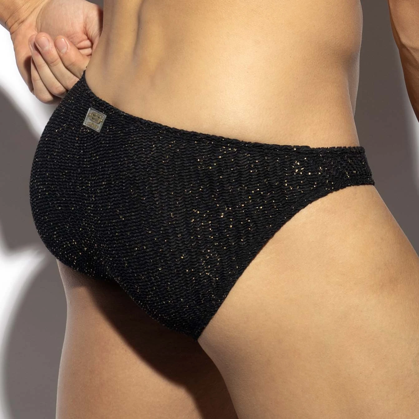 Slip Bikini ES Collection Gold Glitter UN617. Ultra-doux, confortable et extensible, grâce à la technologie Molded, sans coutures ni points de suture, il offre une silhouette élégante et époustouflante. Fabriqué dans une matière composée d’une base en maille délicate et robuste et de fils métalliques dorés entrelacés. Etiquette ES Collection en silicone au dos. 93% Polyamide, 7% Elasthanne.