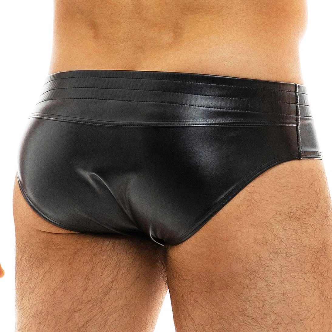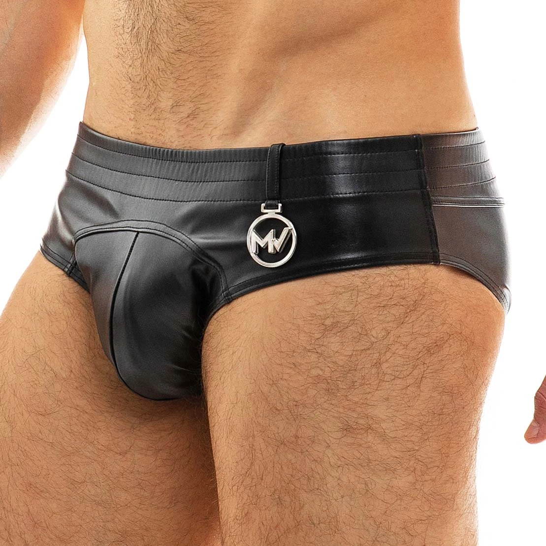 Slip Modus Vivendi 20515. Slip taille basse, trÚs élégant. Aspect cuir. Petite plaque logotée au nom de la marque sur le cÎté. 100% Polyester.