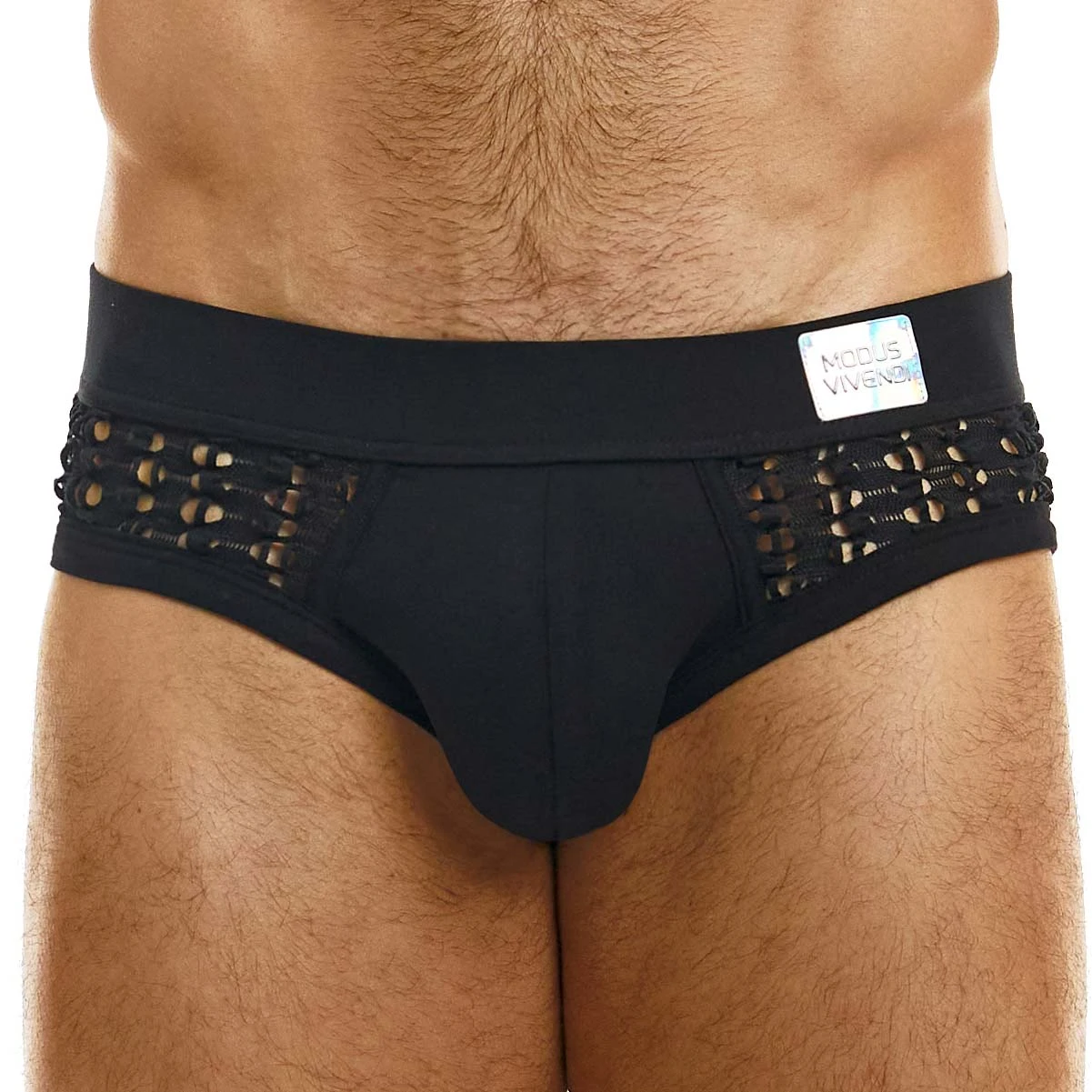Slip Modus Vivendi Hole 02313. Modus Vivendi présente la gamme Hole. Slip taille basse dans une coupe ajustée en tissu tricoté style crochet, finitions en coton côtelé. Ceinture élastique logotée au nom de la marque. 60% Coton, 40% Polyester.