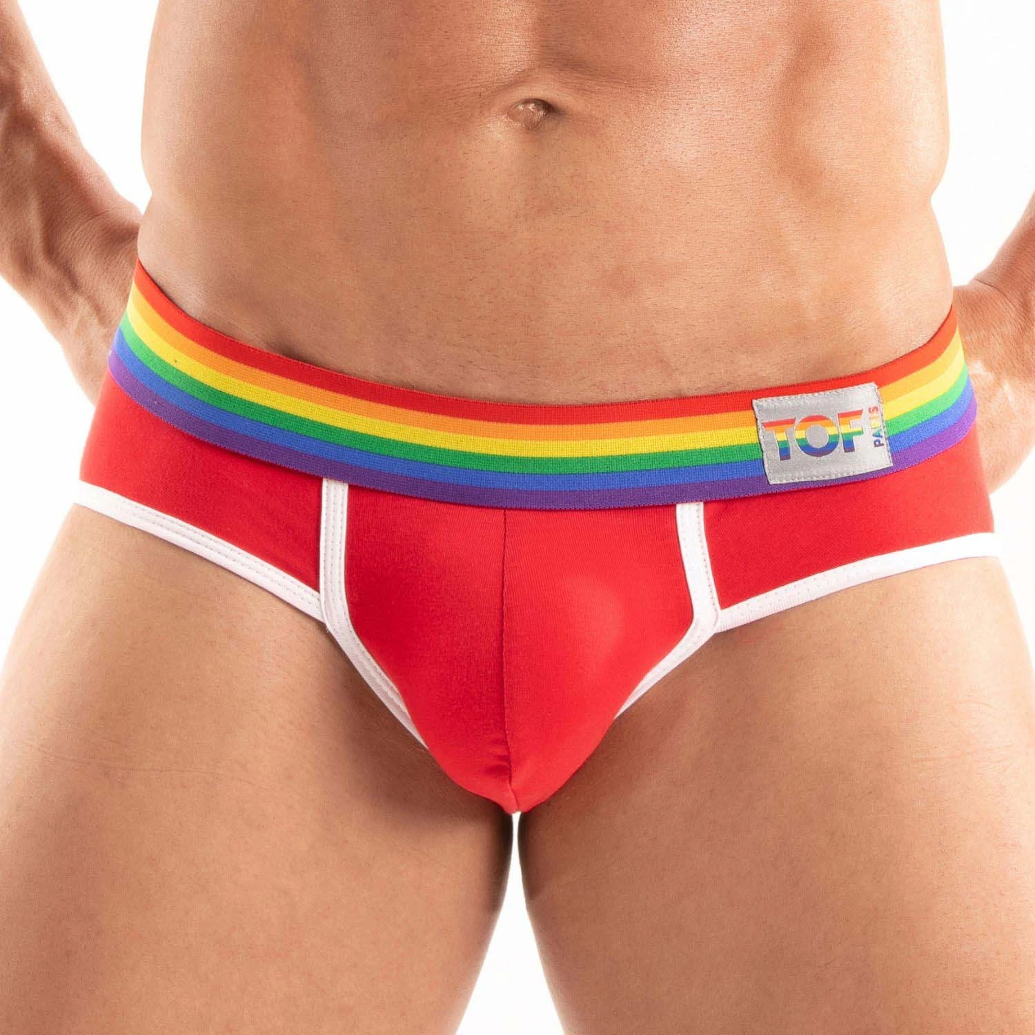 Slip Pride TOF PARIS TOF532R. Slip en coton doux et bi-stretch. Très confortable. Poche frontale généreuse et non doublée qui vous assure un excellent maintien. Ceinture élastique rainbow avec le logo de la marque. Très agréable à porter. 93% Coton, 7% Elasthanne.