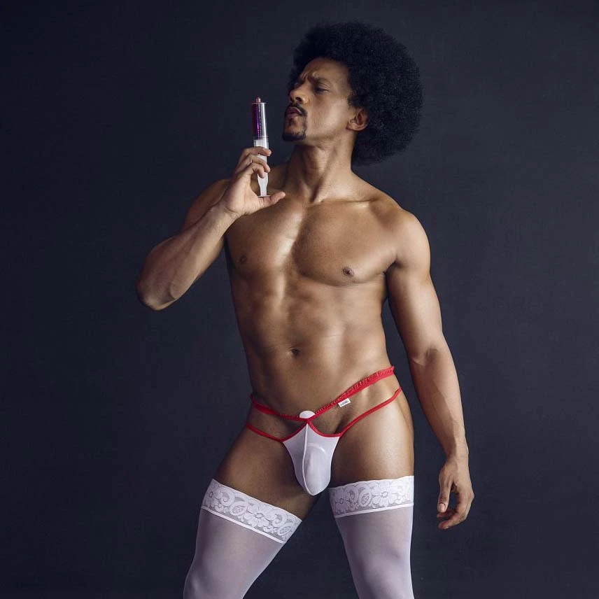 String Candyman 99833. String sensuel dinspiration infirmière, il est doté dune élégante poche blanche ornée dune croix rouge, de détails à lanières et de jarretelles assorties, cet ensemble est prêt à transformer nimporte quelle soirée en une expérience inoubliable. Les Bas sont vendus séparément reference 99533. 95% Polyamide, 5% Elasthanne.